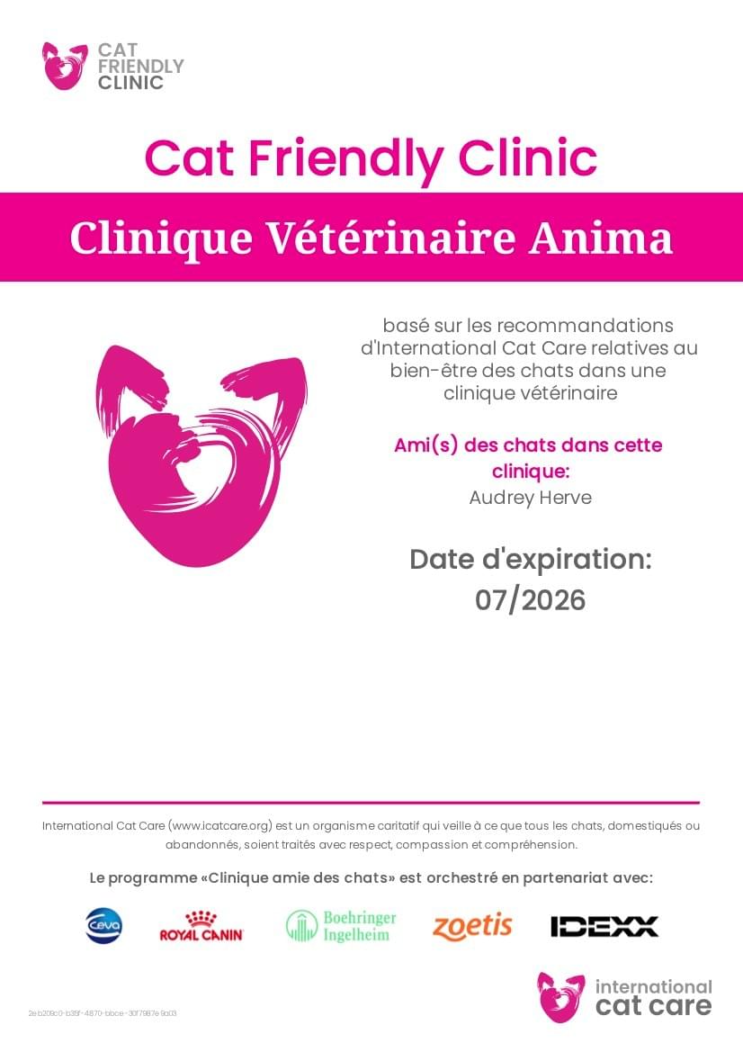 L'accréditation du label cat friendly est un renforcement de notre adhésion au réseau CAP douleur dans la gestion du bien-être de l'animal et de la communication auprès du propriétaire. C'est dans cette optique qu'une salle de consultation dédiée aux chats et une chatterie d'hospitalisation ont été ouvertes.